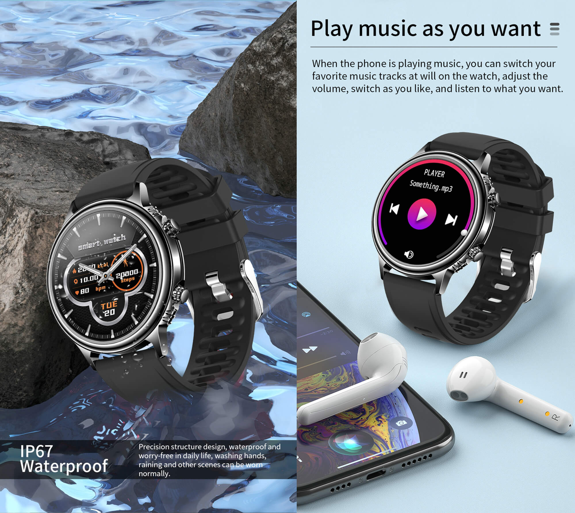Suitable for daily use with the IP67 waterproof smart watch, not for swimming or soaking in water. It resists rain and a small amount of splashing from washing your hands and face.