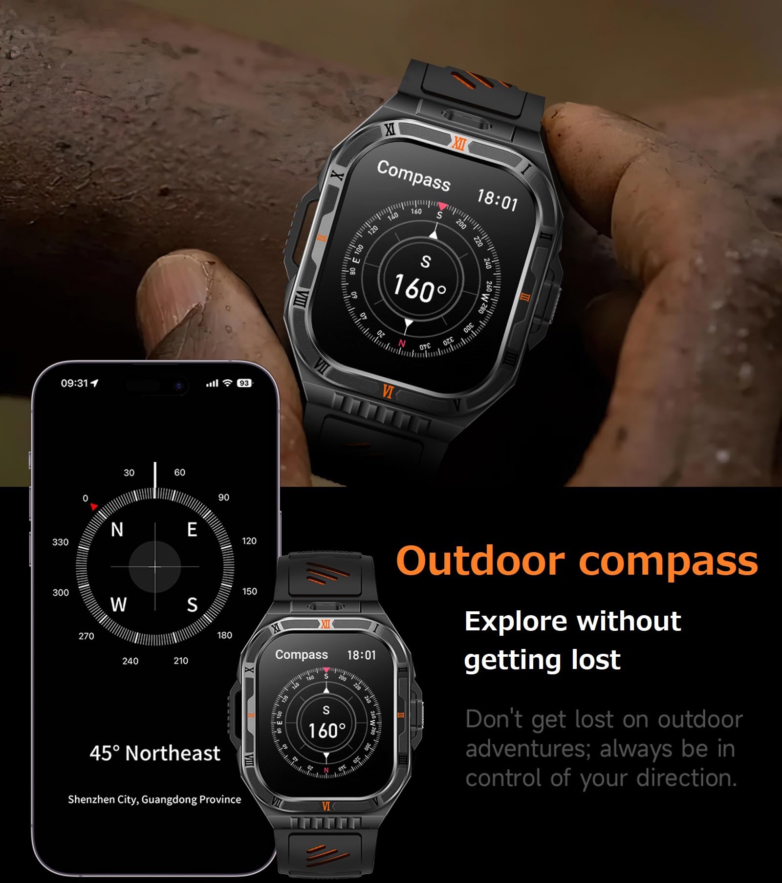 • 🧭 [Built-in Digital Compass & Tactical Flashlight]Never lose your way outdoors. The integrated electronic compass helps you stay oriented during hiking, camping, and adventures. The LED flashlight features high-beam lighting and S OS emergency mode, ideal for night use and outdoor safety. 🔦