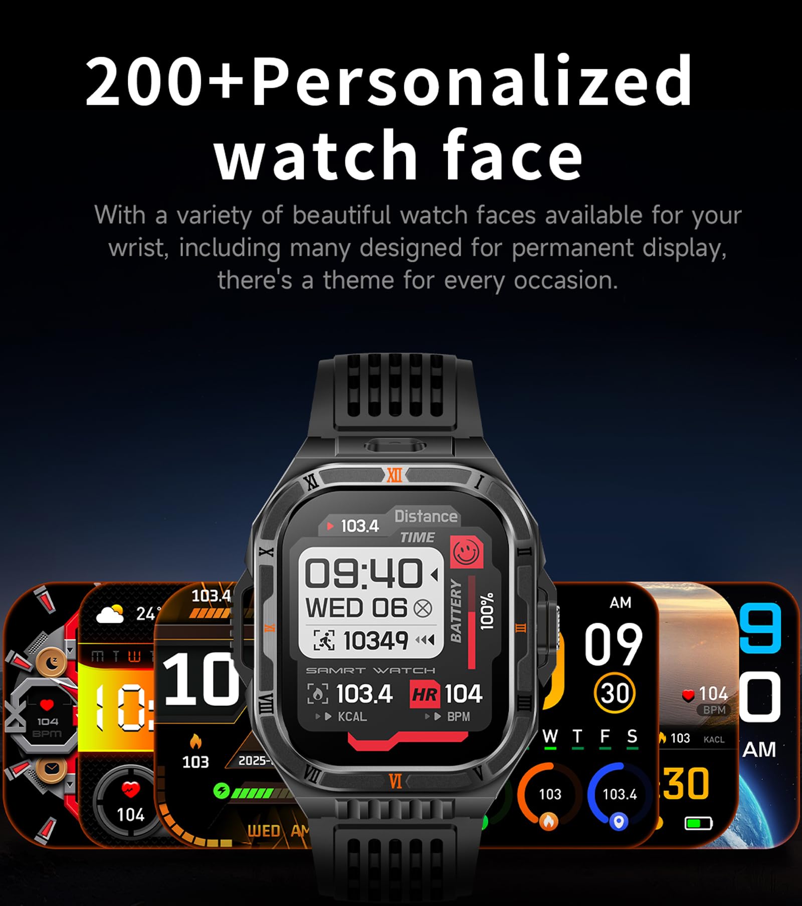 • 💧 [IP68 Waterproof & 200+ Custom Watch Faces]Designed for everyday durability with IP68 waterproof protection, suitable for daily wear and workouts. Customize your style with 200+ watch faces, from tactical to modern—match your watch to your mood or mission. ⌚