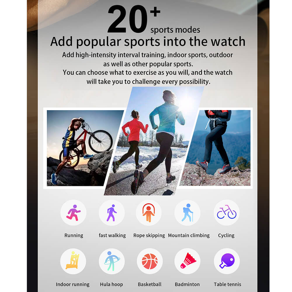 The fitness watch supports 20+ professional sports modes such as high-intensity interval training such as running, cycling, basketball, etc. Accurately monitor and analyze key exercise data such as heart rate, pace, and calorie consumption to help you improve your workout results.
