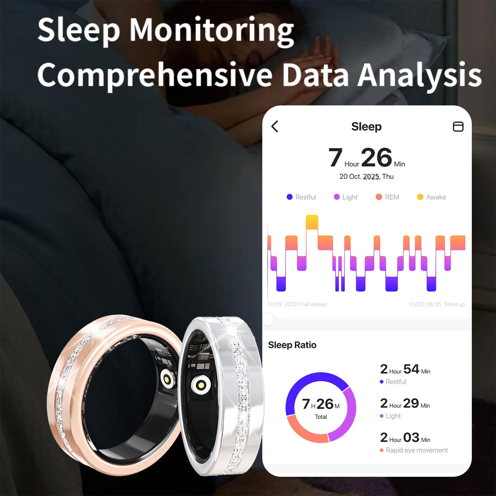 • CONVENIENT LIFE,SLEEP RING : Automatically monitor sleep at night,record sleep duration,analyze sleep data and sleep depth,help you develop good sleep habits